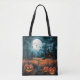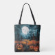 A Spooky Night: This tote bag features a hauntingly atmospheric scene that transports you to a dark and mysterious night. The full moon casts an eerie glow, illuminating the surroundings with an otherworldly light.