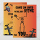 Fiery orange-to-red Halloween party invite with skeleton, skull, bats, zombie, and spider web spooky details. Set the stage for a frightfully fun night with this bold Halloween party invitation. The front features a fiery orange-to-red gradient background with a playful skeleton holding a skull on a platter, waving with a bony hand. Creepy black lettering invites guests with the phrase: "Come on over. We’re just dying for YOU to join us." A tiny tombstone with a cross and bat accent adds eerie charm at the corner.