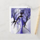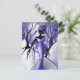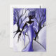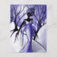 Creepy art postcard featuring a dark surreal illustration of a monster creature resembling a woman with black skin and glowing eyes wearing a beautiful violet dress in the moonlit snowy winter forest with strange trees. Mixed media - ink, watercolor and digital art.