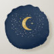 Introducing our exquisite Crescent Moon Starry Night throw pillow, a celestial marvel that will transport you to a dreamy starlit sky. Crafted in a captivating dark navy blue shade reminiscent of the night sky, this throw pillow is adorned with a mesmerising gold crescent moon at its centre, surrounded by a celestial constellation of gold and light silver stars.