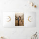 This white and gold tri-fold wedding photo invitation weaves together your cherished memories with a celestial motif, making it an ideal choice for themes like "Under the Stars," "To the Moon and Back," or "Written in the Stars." The design merges the invitation itself, the details of your wedding, and the RSVP into one seamless, sophisticated ensemble. Additionally, it offers the flexibility to personalise with a QR code, allowing you to substitute the given URL with one of your choosing. Embellished with exquisite illustrations of a golden crescent moon, a glowing sun halo, assorted planets, constellations, and galaxies, this invitation captures the enchanting allure of the starry night sky. Opt for a single photo to feature on both sides, or select two unique images to enhance the variety.