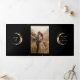 This romantic tri-fold wedding invitation combines personal photographs with a unique cosmic and mystical theme ("Under the Stars," "To the Moon and Back," or "Written in the Stars,") offering a seamless integration of your wedding invitation, details, and RSVP in a single, elegant package. You also have an option to personalise it with your QR code - simply replace the provided URL with your own. The elegant design features illustrations of a golden crescent moon, a radiant sun halo, various planets, constellations, and galaxies, and evokes the enchanting allure of a starry midnight sky. You can opt for a single photo to grace both sides or select two distinct images for a unique touch.