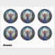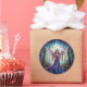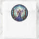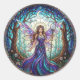 This round fantasy inspired sticker features a stained glass illustration of a moonlit fairy in a flowing purple gown with iridescent wings, holding a staff amid enchanted forest and crescent moon.