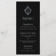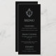 Above the text, there is a monogram in a vintage faux gold crest. The title "Menu" and the subtitles are written in caps. All text can be personalised and has a grey colour similar to the faux silver crest. The background is black. On the back, there is the same monogram in crest. The monogram is formed by the two initials separated by a thin line.