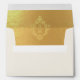 An elegant ivory and gold envelope with a monogram from 2 initials in a vintage crest on all sides, recommended for a ivory and gold wedding invitation. It is ivory outside (almost white) and faux gold foil inside. The vintage crest is also faux gold foil. The return address is printed on the flap, in golden caps, with the monogram in crest on its left. The monogram is formed by the 2 initials of the bride and groom, separated by a line.