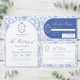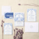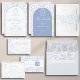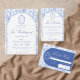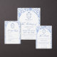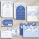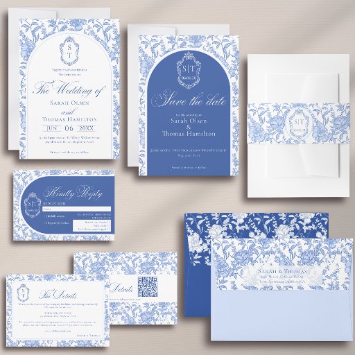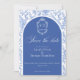 Delft blue floral save the date card, designed in a refined blend of chinoiserie and French toile de Jouy style. The soft botanical illustrations frame an arched layout featuring an elegant wedding crest monogram, perfect for couples who love vintage, historic, and European-inspired aesthetics. Classic script typography pairs beautifully with the ceramic-blue palette, making this design an effortless nod to the tradition of “something blue.” Fully customizable with your names, date, and location, it’s an exquisite choice for any romantic or sophisticated wedding theme.