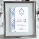 Delft blue floral table number card, designed in a refined blend of chinoiserie and French toile de Jouy style. The soft botanical illustrations frame an arched layout featuring an elegant wedding crest monogram, perfect for couples who love vintage, historic, and European-inspired aesthetics. Classic script typography pairs beautifully with the ceramic-blue palette, making this design an effortless nod to the tradition of “something blue.” Fully customizable with your names, wedding crest and table number, it’s an exquisite choice for any romantic or sophisticated wedding theme.