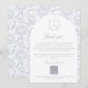 Dusty Blue Monogram Crest Wedding Thank you card: Vintage-inspired line art monogram crest with elegant dusty pale blue typography. Features a chinoiserie floral pattern in the shape of an arch and on the reverse for timeless sophistication. Elegant script font for a formal and classic style. Let your guest get access to your wedding online photo album or photo website.