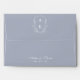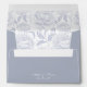 Dusty Blue Monogram Crest Wedding Envelope: Vintage-inspired line art monogram crest in white with elegant dusty pale blue background. Features a chinoiserie floral pattern on the inside for timeless sophistication. Elegant script font for a formal and classic style.