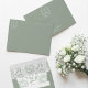 Sage Green Monogram Crest Wedding Envelope: Vintage-inspired line art monogram crest in white with elegant sage green background. Features a chinoiserie floral pattern on the inside for timeless sophistication. Elegant script font for a formal and classic style.