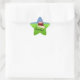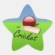 Cricket, bat and ball on grassy horizon, star-shaped sticker.
