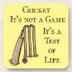 Cricket It's not a Game It's a Test of Life - Design also shows Cricket Bat, Cricket Ball, and Wickets.