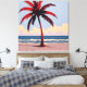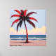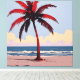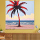 A bold and artistic palm tree with deep red hues stands tall on a tranquil beach. The ocean waves gently kiss the shore, while soft clouds float in the sky. A perfect blend of tropical serenity and modern aesthetics.