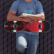Push the limit with this crimson synthwave skateboard. This high-intensity design features a sleek sports car speeding toward a massive red neon sun. With silhouetted palm trees and a glowing road, it captures the raw energy of 80s futurist and cyberpunk night racing. Perfect for those who want an aggressive, bold look for their next session or as a statement piece of retrowave wall art.