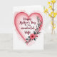 This greeting card features a bright white background with a large heart centred on the front, shaded in soft rose and blush tones with gently feathered edges. Inside the heart, a flowing line of deep crimson lettering sits across the middle, addressing a loved one in a way that suggests closeness and appreciation ❤️. Along the right side of the heart, a thin vine climbs upward, dotted with dark green leaves and small red blossoms that feel like little affectionate gestures tucked into the design. Near the lower right, a larger fuchsia flower opens in layered petals with a darker centre, adding a romantic focal point. Smaller blooms and bits of greenery cluster around it, as if they’re leaning in towards the heart and its message. The contrast of warm pinks and reds against the white space keeps the layout airy while still intimate, like a quiet note shared between two people 🌼. The text remains contained within the heart, while the vine and flowers trace the outer right edge and gather most densely at the lower right corner.