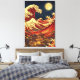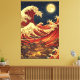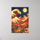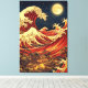 This striking canvas print depicts a dramatic Japanese coastal scene inspired by traditional ukiyo-e aesthetics. Towering crimson waves rise under a luminous full moon, framing a quiet seaside village that evokes calm in the face of nature’s raw power.