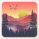 An abstract landscape of a mountain scene with a sunrise and trees in bold shades of crimson and red.