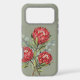 Elegant watercolor illustration of vibrant red protea blooms with soft green eucalyptus leaves, delicately painted to capture natural beauty and botanical charm