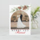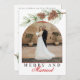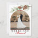 Merry & Married Crimson Red and White Pine Cone Greenery Photo Christmas Card - Celebrate your first Christmas as newlyweds with this elegant holiday card featuring a crisp white background with red accents and festive pine greenery. The trendy arch-shaped photo frame highlights one cherished image—ideal for a wedding or engagement photo. Beautiful calligraphy adds a romantic touch, and the back includes an editable message area for personalized greetings. A stylish way to share winter wishes and mark your "First Christmas as Mr. & Mrs."