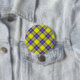 This button stands out from the rest - it has a yellow and purple tartan pattern in a criss-cross form all over.