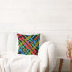 This cheerful throw pillow displays a colourful abstract pattern of crisscross lines in red, orange, green, yellow, blue and black on a black background. The image is repeated on the back.
