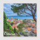 View of the small town Omis surrounded with mountains, Cetina river and sea, Makarska Riviera, Croatia. View of pine tree, old city center with red rooftops and blue see.