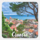View of the small town Omis surrounded with mountains, Cetina river and sea, Makarska Riviera, Croatia. View of pine tree, old city center with red rooftops and blue see.