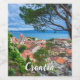 View of the small town Omis surrounded with mountains, Cetina river and sea, Makarska Riviera, Croatia. View of pine tree, old city center with red rooftops and blue see.
