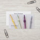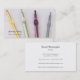 This business card has a colour photograph of a 4 colourful crochet hooks. They are gold, sea foam green, purple, and dusty blue. You can easily customise all of your business information on the front and back of the card. This would be a great business card for yarn retailers, or for a handmade crochet business.