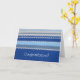 Congratulations is white script on front. Close up photograph of crochet pattern in stripes of white and shades of blue. Dark blue is predominant. Inside text "Warm wishes for your new bundle of joy"