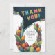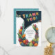 This thank you card has a cute alligator crocodile with a big open mouth and a colourful tropical frame made of fruits and green leaves.