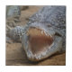 Close up of a crocodile with an open mouth lying on the yellow sand