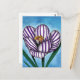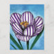 Crocus Will Preen is a simple floral featuring a purple and white striped open crocus bloom over a blue mottled background.