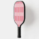 This pickleball paddle has a geometric design of rectangles with diagonal ends in pink and red, repeating throughout the design. If you like the design but prefer different colours, message me.