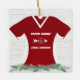 Red and white cross country running jersey with editable name, number, photo and year. Pine Bough along bottom for a festive holiday look. Cross country jersey design continues to the back of the ornament.