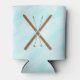 Crossed wooden cross-country skis and ski poles superimposed on a snowy background image. Add your own text on the reverse side.