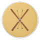 Crossed wooden cross-country skis and ski poles on a buckskin background.