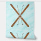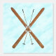 Crossed wooden cross-country skis and ski poles superimposed on a snowy background image.