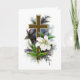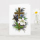 A Brown cross with a white border standing in the middle of a white tulips and green leaves with a blue haze back ground and isolated on white. The word Trust In the Lord. And He will bless you. Worship with all your heart. He will watch you. Listen to what he says to you. He talks quietly in your ear. Obey his every word. He will teach you much are on the second page of the greeting card
