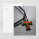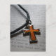 Photography by Angelandspot of a necklace made from an orange cross and a black chain placed on a vintage book page from the days I used to make necklaces from found objects and vintage items and sell them at a local farmers market.
