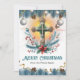 This greeting card features a cross paired with festive candy canes and a vibrant poinsettia, surrounded by Christmas border leaves with ornaments and acorns. The playful yet reverent design captures the spirit of Christmas, celebrating Christ’s birth with joy and warmth. The card also includes delicate blue accents, giving it a serene winter feel, with the leaves and wreath adorned in soft light blue hues. Personalise your message on the back to create a heartfelt and meaningful greeting that honours the true essence of the holiday.