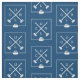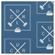Fabric featuring a pattern of crossed curling brooms in white on blue background. Perfect for curlers and curling fans.