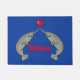 Two narwhals with crossed horns and a red heart and the word "welcome" in red