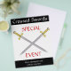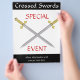 Jewelled mediaeval swords crossed flyer template design. Two renaissance sword weapons crossed with gold and jewels on handle for your event notice flyer. Totally customisable, font, background colours and more all online.