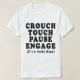 Crouch, Touch, Pause, Engage! It's a rugby thing, where the referee calls out each element of the beginning of a scrum. It's also a pretty darn interesting phrase! Also available on dark tees, as well as without the qualifying comment at the bottom. In other words, if you dare, get the one that DOESN'T say "it's a rugby thing"! Look for it in the SPORTS section of our shop at greenbaby tees!