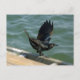 A black crow spreads its wings in preparation for taking flight from the edge of a fishing dock somewhere near Galveston, Tx