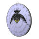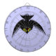 This awesome dart board design features a cartoon style image of a crow. The crow is black with yellow eyes and has its wings outstretched. The background is blue.