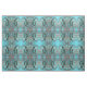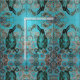painting of a big black crow on a blue background with a pink and gold paisley circle dot pattern.