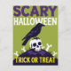 A bold and graphic Halloween postcard featuring a stylized black crow perched atop a white skull and crossbones. The design uses a striking color palette of lime green and dark purple, making the "SCARY HALLOWEEN" and "TRICK OR TREAT" text truly pop. This vertical card is perfect for sending fun, scary seasonal greetings or for giving out to kids as a memorable Halloween treat. Its clean, modern look is highly versatile.