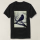 Tee in a black-and-white illustration featuring a sleek black crow perched on a gnarled, leafless branch. The bird's detailed feathers contrast sharply with the stark, skeletal tree limbs, creating a dramatic composition.